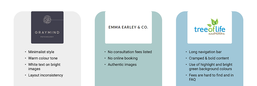 These issues aligned closely with user insights gathered during research; participants frequently mentioned frustration with unclear branding, lack of cost transparency, and difficulty finding the right practitioner. Addressing these concerns became central to the redesign, ensuring the new website would project professionalism, clarity, and trust from the first interaction.
